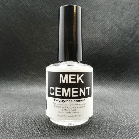 MEK CEMENT is a well-known formula of a polystyrene cement belonging to the family of the acetones (Methyl Ethyl Keton) glues whose purpose is to melt the two polystyrene kit parts to create a very strong bond without excess of glue.